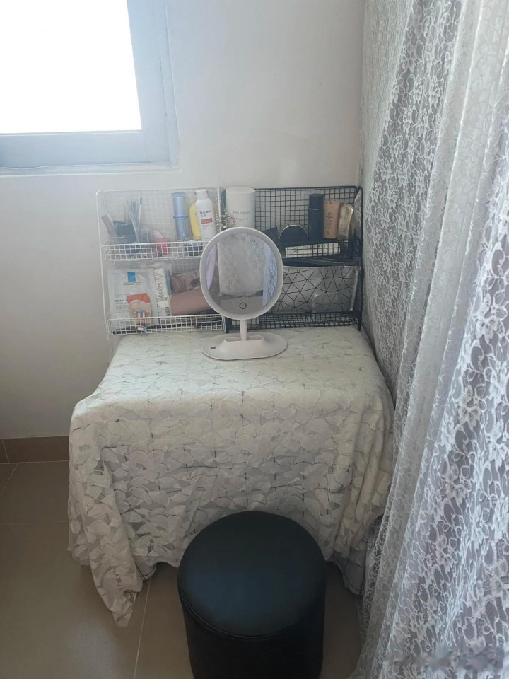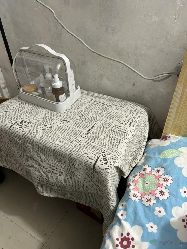 放上帘子之后,在桌面上再放上化妆品和镜子,就是一个梳妆台。是要思路打开,没地方收纳的行李箱,也能充当生活种的很多角色,还能省钱。