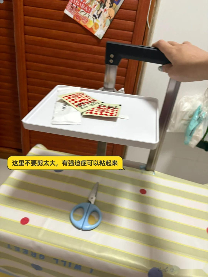 一切准备就绪之后,再铺上防水桌布,就很完美了。另外还可以在拉杆上安装一个置物托盘。不占据桌面的位置,还能帮忙收纳一些零散用餐工具。