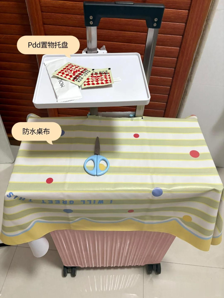 要我们把两个尺寸一样的行李箱摞放在一起,然后加上一个亚克力板,再用漂亮的桌布这么一铺,它就能秒变一张书桌。